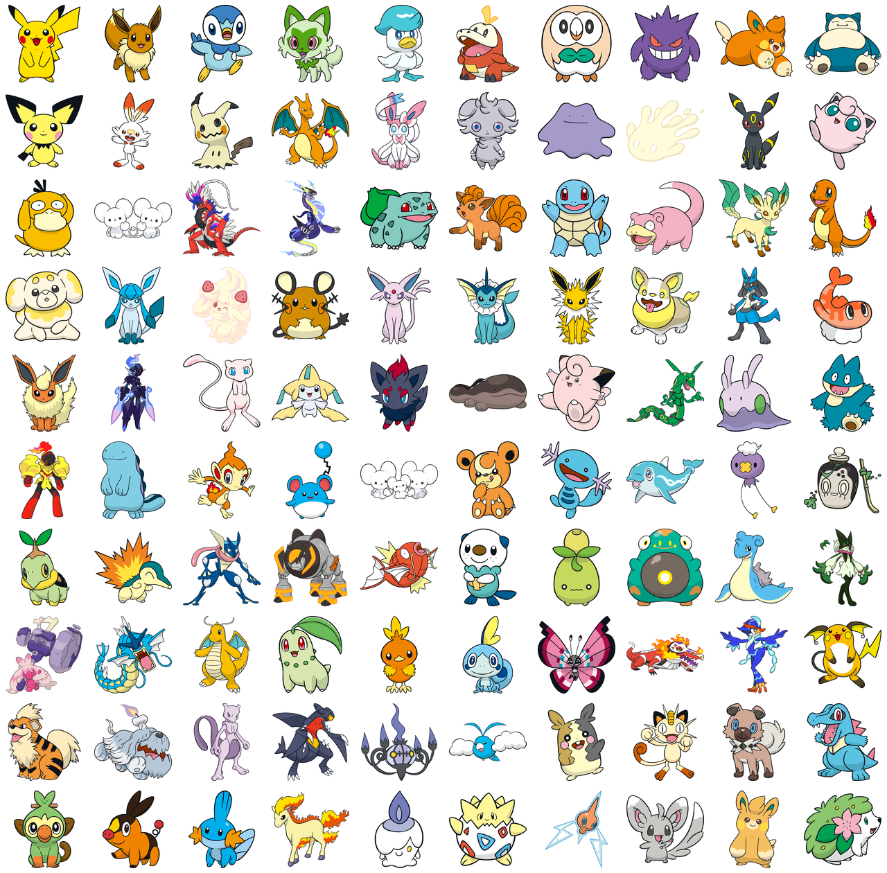 So far, so good. Finally, Pokémon Center ONLINE provides a high-quality PNG image for every Pokémon, but because each image URL is associated to a National Pokédex number (Ndex) and not a name, we need to map each Japanese name back to its Ndex. While it was tricky to find Japanese names on an English website, the ever-reliable Bulbapedia was the best canonical source I could find for this purpose. Once we have the numbers, we download all 100 images concurrently and concatenate them into a 10x10 grid with montage, part of the ImageMagick suite: